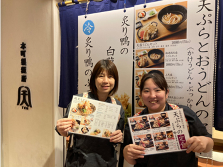 料理提供やレジ作業のホールのお仕事やうどんや天ぷらの調理・仕込みのキッチン作業など行ってもらいます。